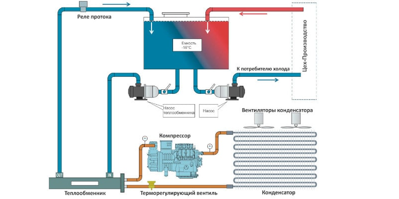 - Чиллер охлаждает гликолевый раствор (рассол).
