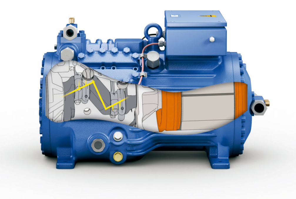 Состоит из цилиндра, поршня, клапанов и кривошипно-шатунного механизма. Поршень совершает возвратно-поступательное движение, всасывая и сжимая хладагент.